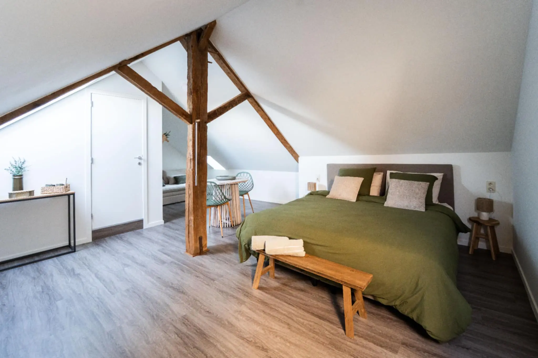 Une chambre comme une feuille d’olivier : simple, élégante, enracinée. Le vert doux apaise, les matières naturelles réconfortent, et la lumière filtrée invite au lâcher-prise. L’Olive, c’est une halte douce, entre nature et chaleur, où l’on respire le calme comme un parfum d’été.