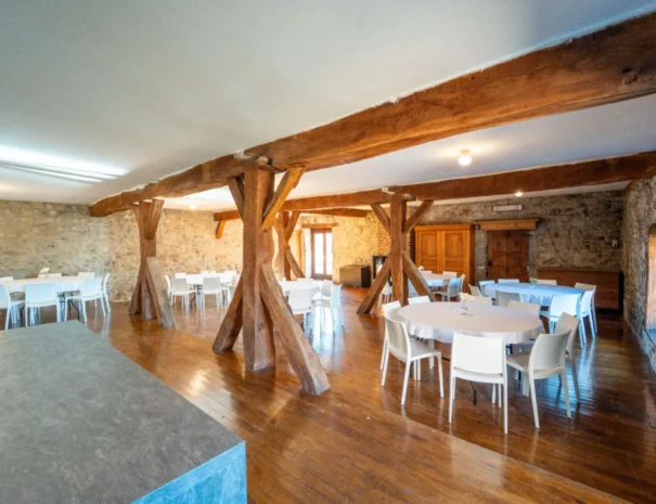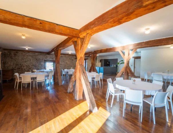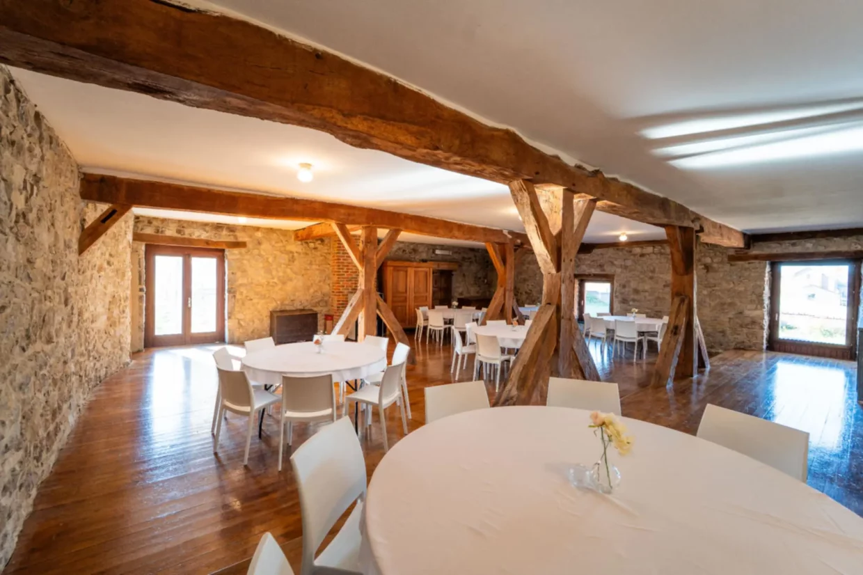 Cette salle d’environ 120m² est caractérisée par ses magnifiques murs en pierres apparentes et ses impressionnantes poutres en bois massif qui confèrent un cachet indéniable. Son sol en parquet chaleureux et son poêle à pellets viendront ajouter une ambiance cosy et élégante à vos évènements.